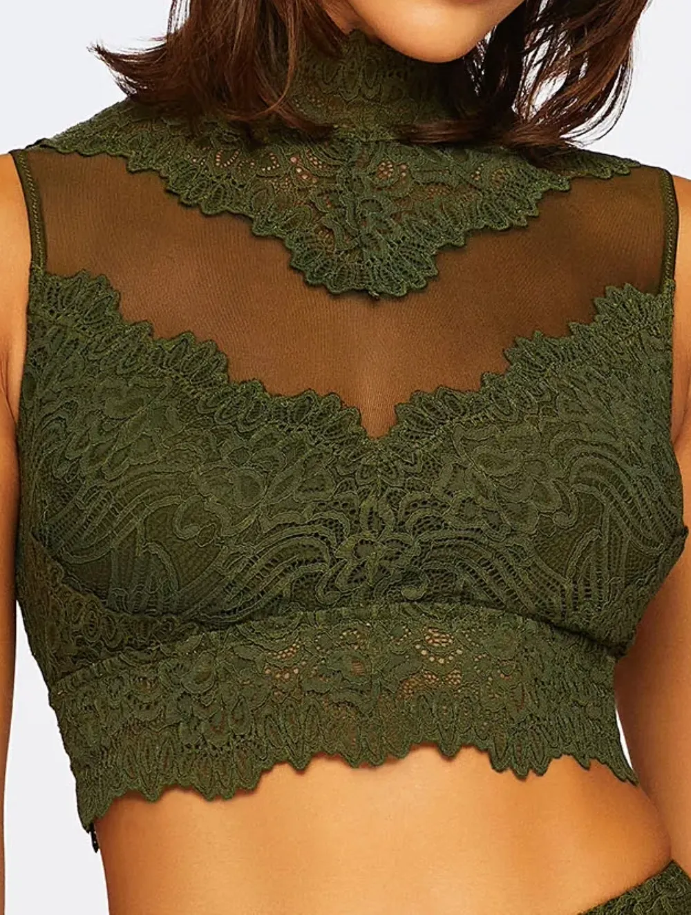 Cropped de gola alta com botões na gola, fecho de ímã de metal nas costas, bojo removível, recortes em tule e renda na frente.